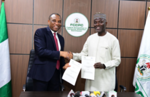 Executive Vice Chairman/CEO, Federal Competition and Consumer Protection Commission, Dr. Tunji Bello and Executive Vice Chairman/CEO, Nigerian Communications Commission, Dr. Aminu Maida, during the Memorandum of Understanding (MoU) signing ceremony between the two regulatory agencies for increased telecom consumer protection in Abuja recently